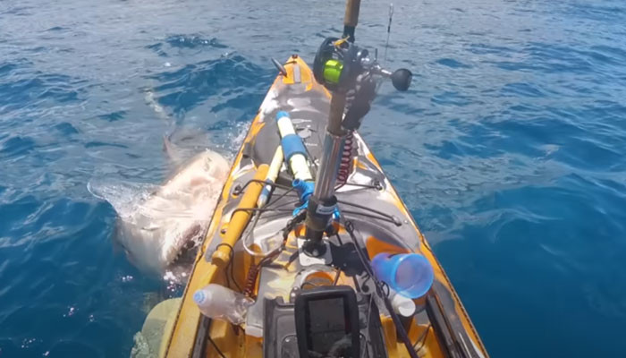 Video was captured by angler's GoPro camera when tiger shark crashed into his kayak and chewed its side