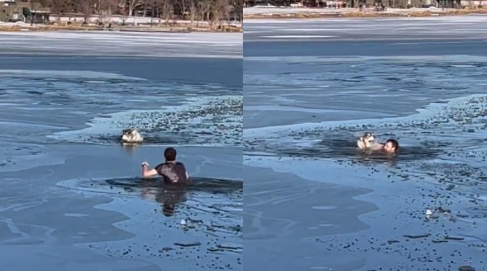 Heartwarming video goes viral which shows man jumping into lake to save a husky who was struggling to get out of water
