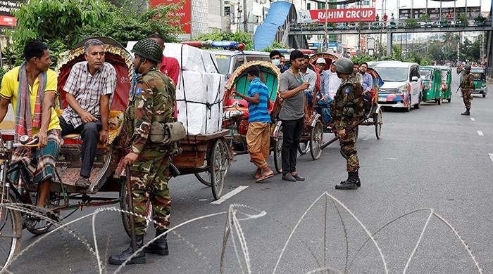 Members of the Bangladesh Army speak with people who came out on roads during a curfew imposed in response to student-led protests against government job quotas, in Dhaka, Bangladesh, July 20, 2024. — Reuters